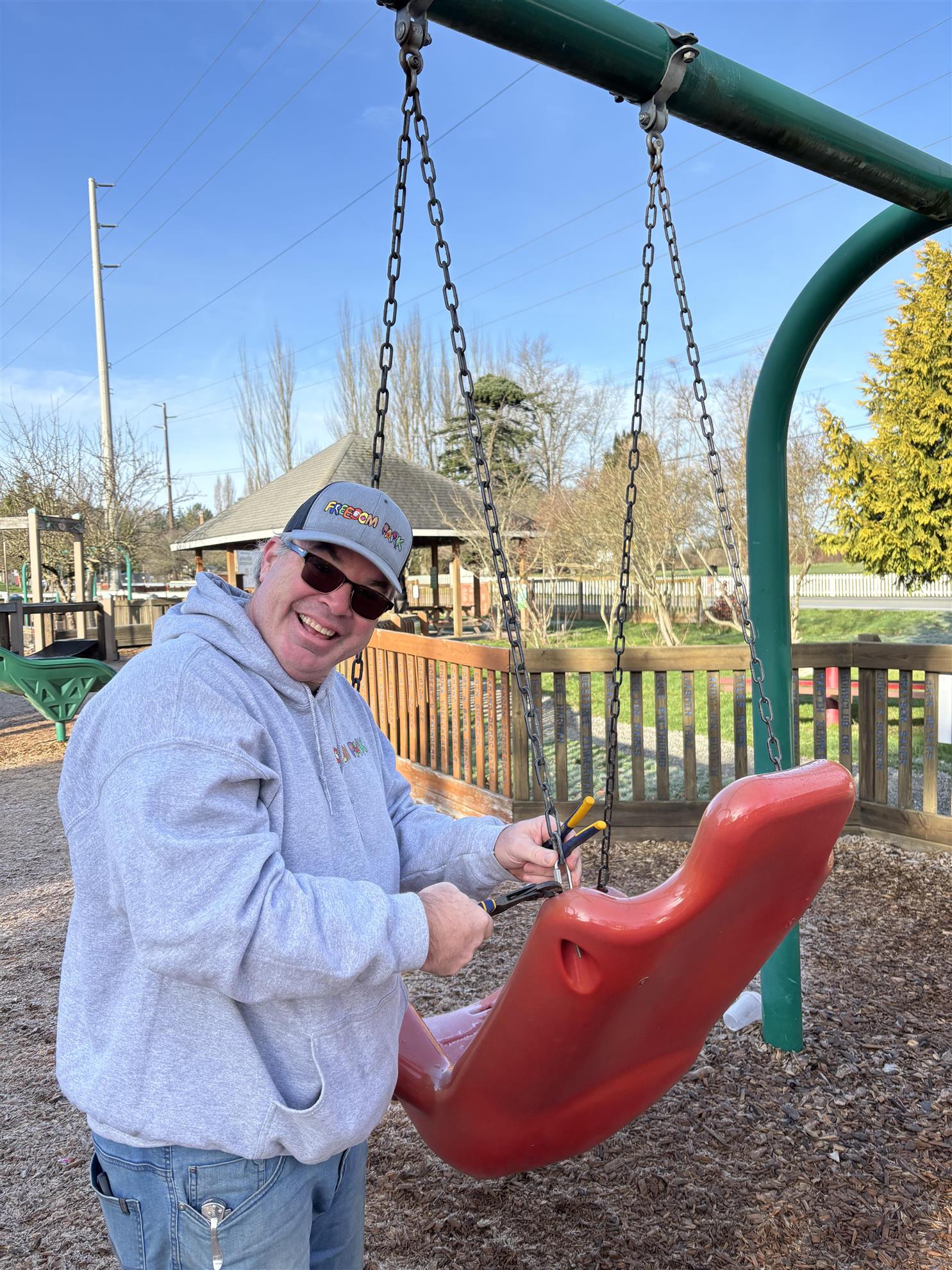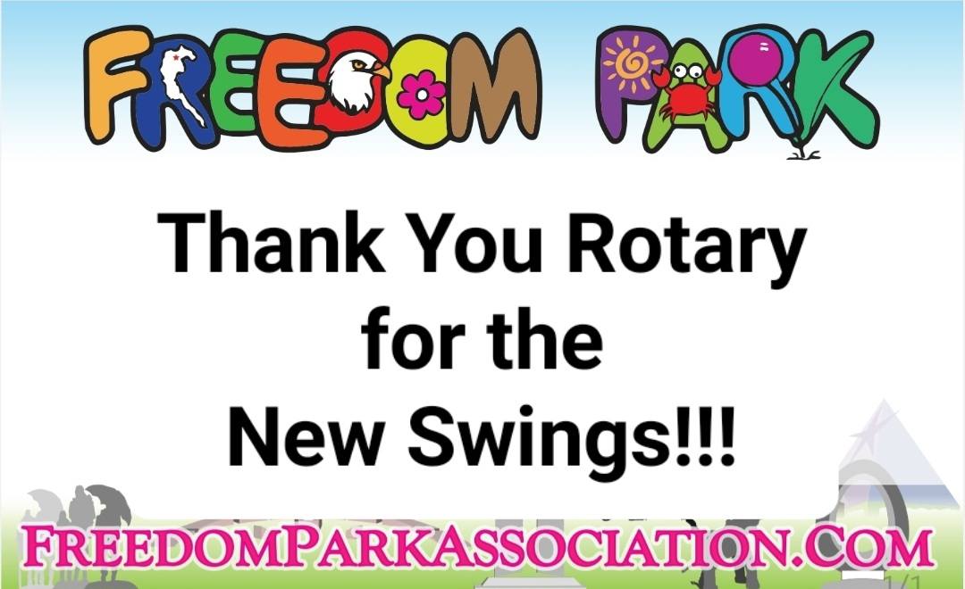 Steve Goforth assisted Grant Shaw from Freedom Park to get all the swings installed. Be on the look out for volunteer opportunities to help freshen up the park. The new goal is for our Club to work with the Freedom Park Foundation to Preserve & Improve the playground.