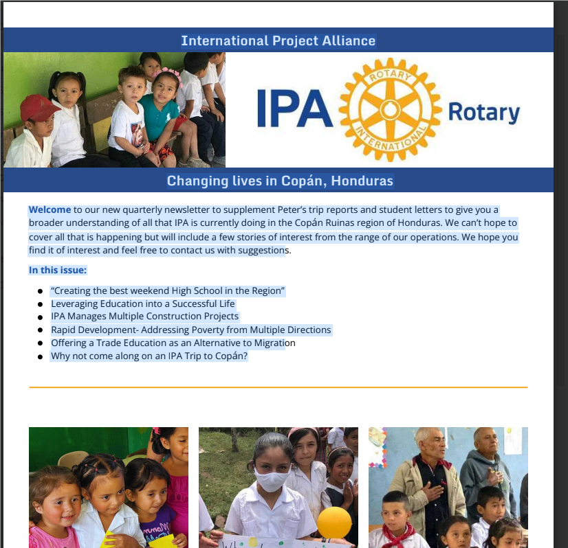 Club member, Nancy Voelckers attends the monthly zoom meetings representing our club. We are supporting a school in El Florido and many of our club members support individual students.